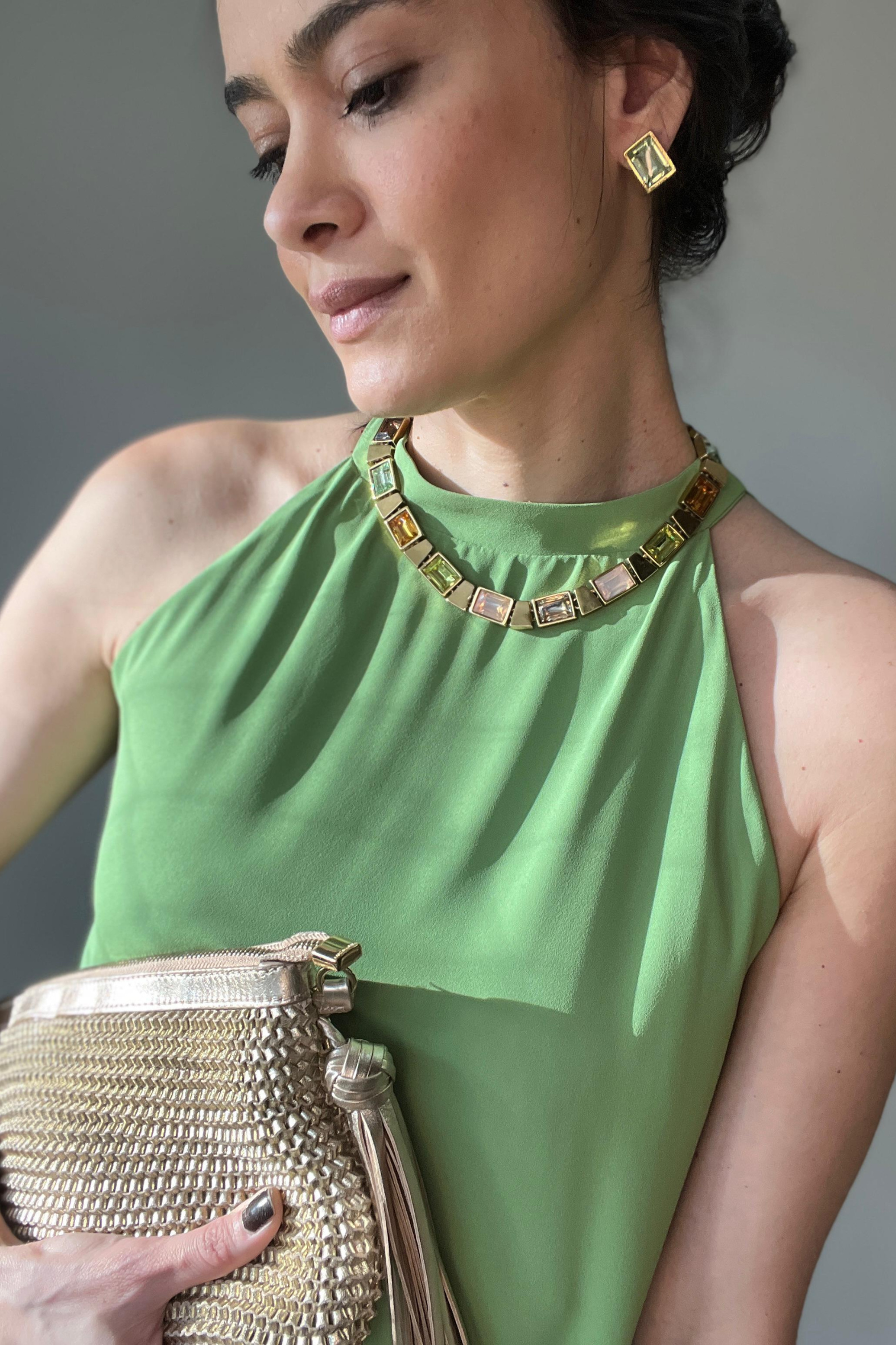 Uma composição moderna e elegante, marcada pelas linhas retas dos cristais retangulares. O design geométrico traz sofisticação e presença ao visual, criando um conjunto equilibrado e contemporâneo, perfeito para quem busca estilo com personalidade e versatilidade.