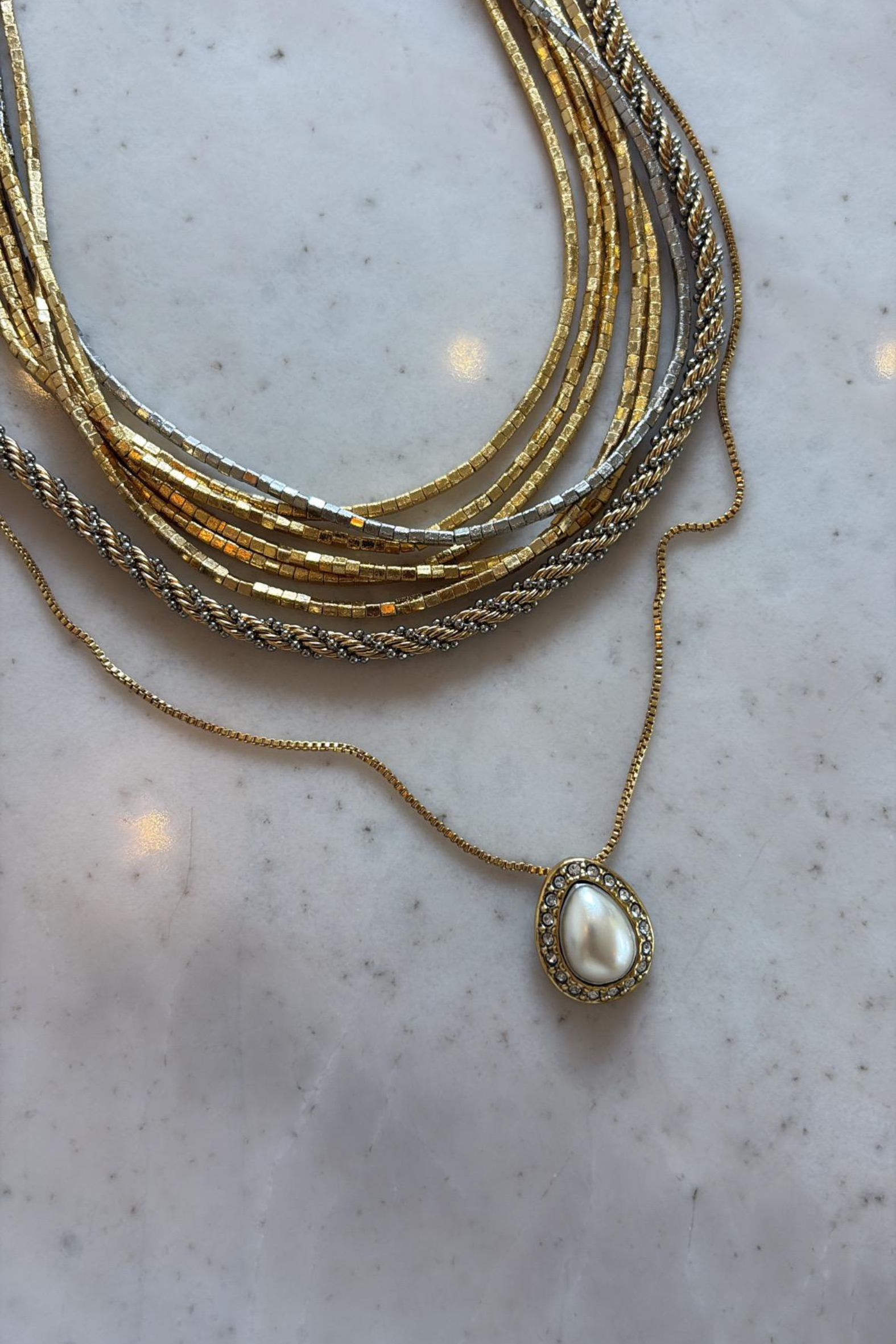 Uma composição de colares pensada para valorizar cada detalhe do seu estilo. As sobreposições criam profundidade e movimento, resultando em um visual moderno, elegante e cheio de personalidade.