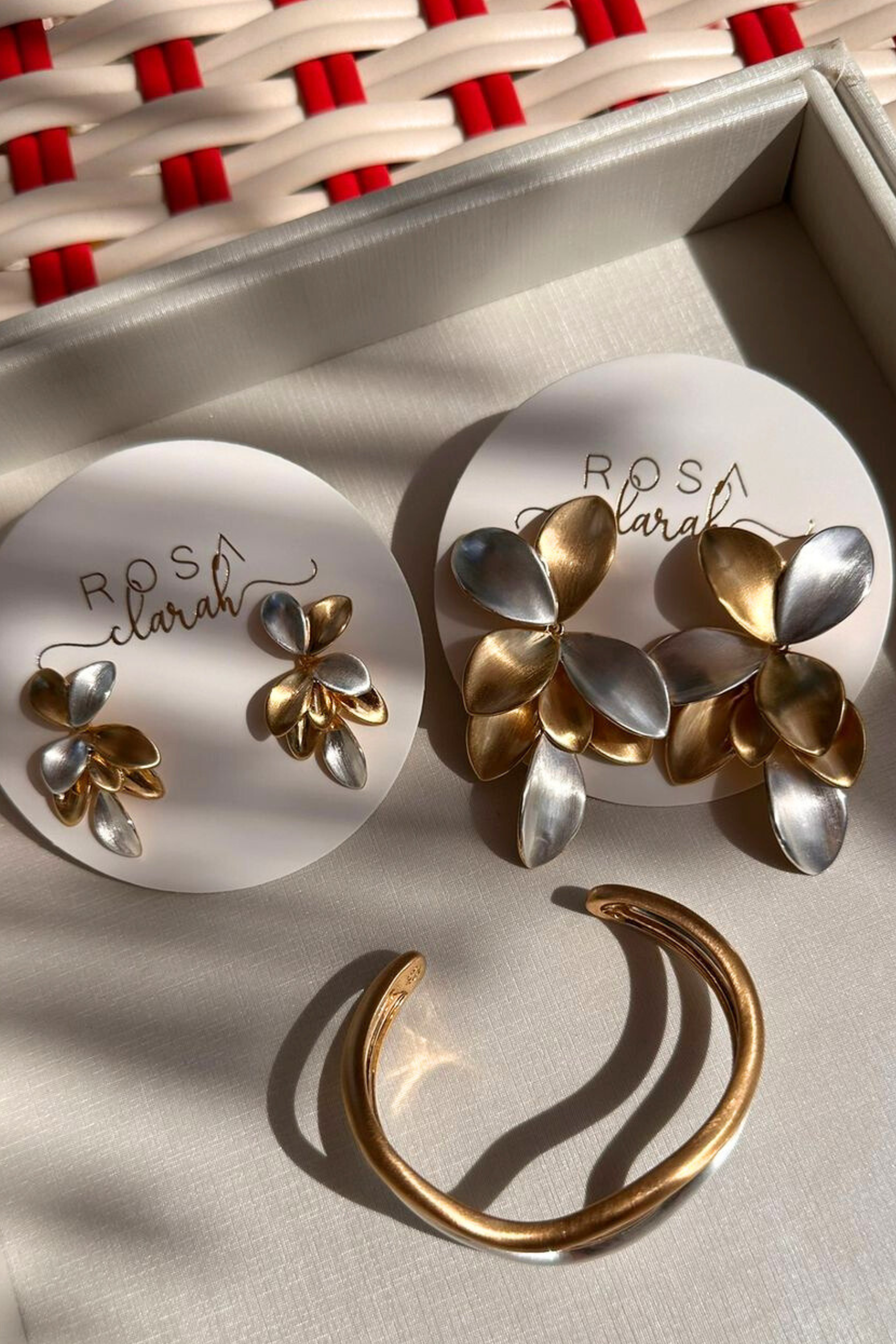 A harmonia perfeita entre o brilho suave do escovado e o contraste dos banhos metálicos. Essa composição une o dourado e o ródio em um equilíbrio contemporâneo, revelando sofisticação e versatilidade em cada detalhe. Ideal para quem aprecia peças com textura, acabamento refinado e um toque moderno.